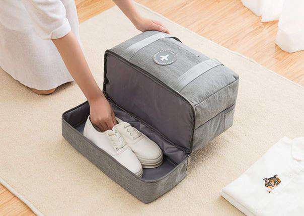 El acceso principal está pensado para artículos de mayor uso, el impermeable para dejar la ropa sucia, húmeda o botellas que puedan contaminar el resto del bolso. Y debajo va el calzado en un acceso súper cómodo.