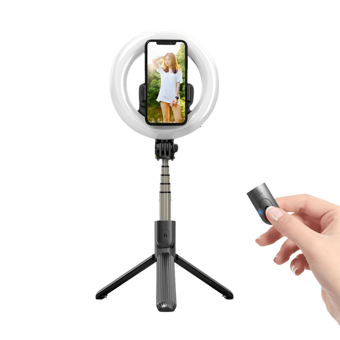 Trípode y Palo Selfie con Aro LED a Batería + Control Remoto Bluetooth